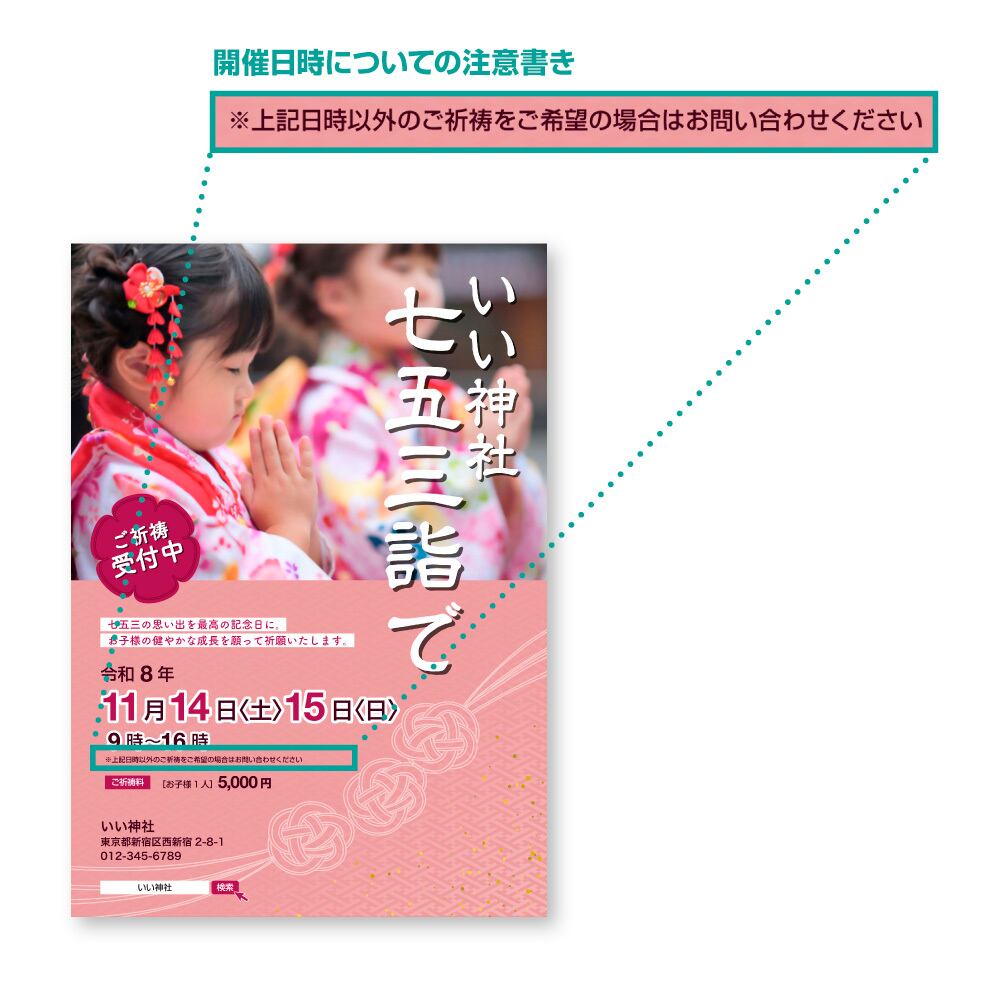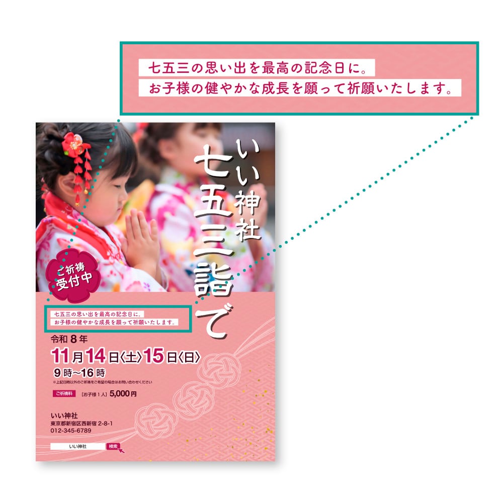 神社情報(神社名・住所・電話番号)と行事の日時、祈祷料等を掲載いたします。