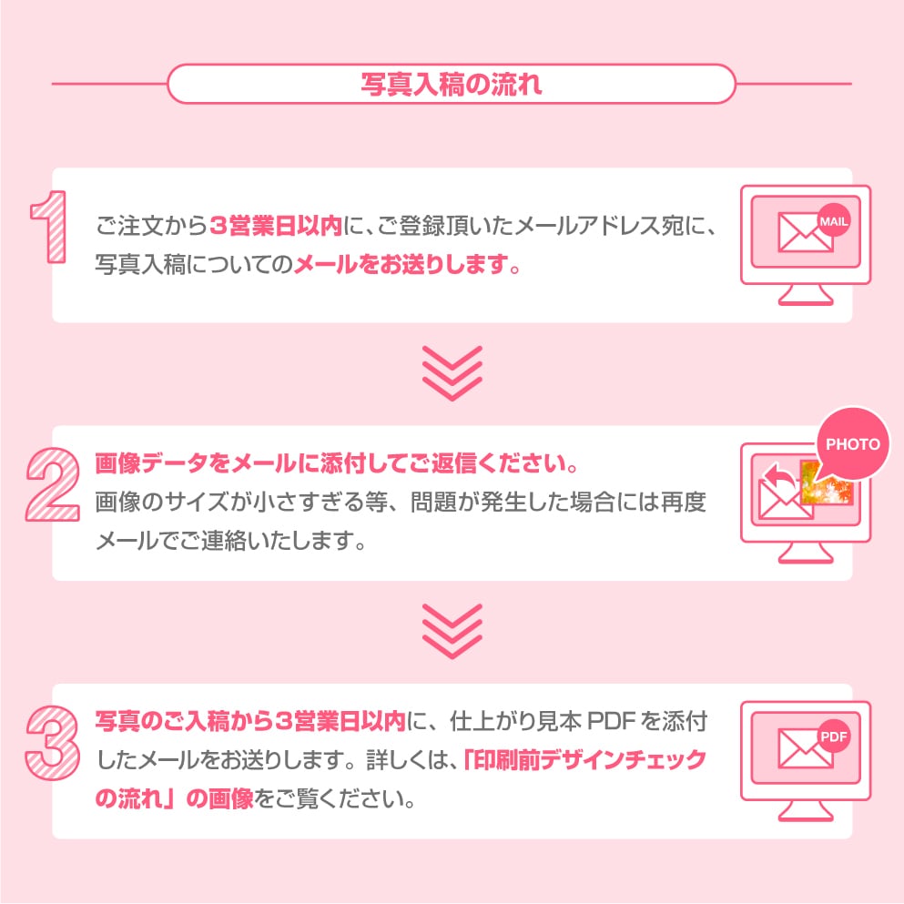 ご注文から3営業日以内に仕上がり見本PDFをメールでお送りします(写真の差し替えをご希望の場合は、写真入稿から3営業日以内にお送りします)