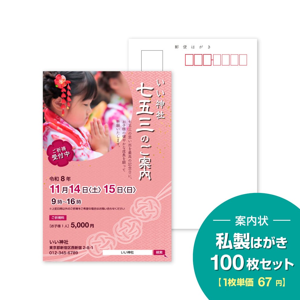 この秋に七五三を迎えるお子様のご家族に向けて、日時やご祈祷料をご案内する七五三用の行事案内はがきです。